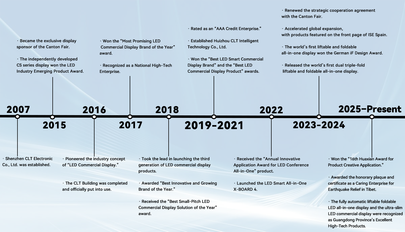Established in 2007, CLT is a national high-tech enterprise, integrating R&D, design, production, operation, marketing and service. mainly engaged in LED display business (LED small pitch professional display and commercial LED display system integration solutions.